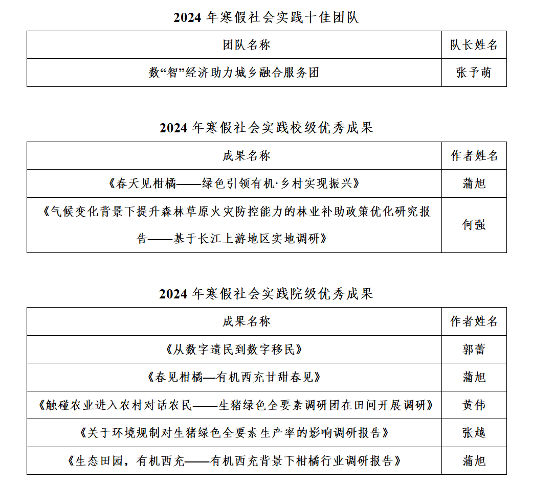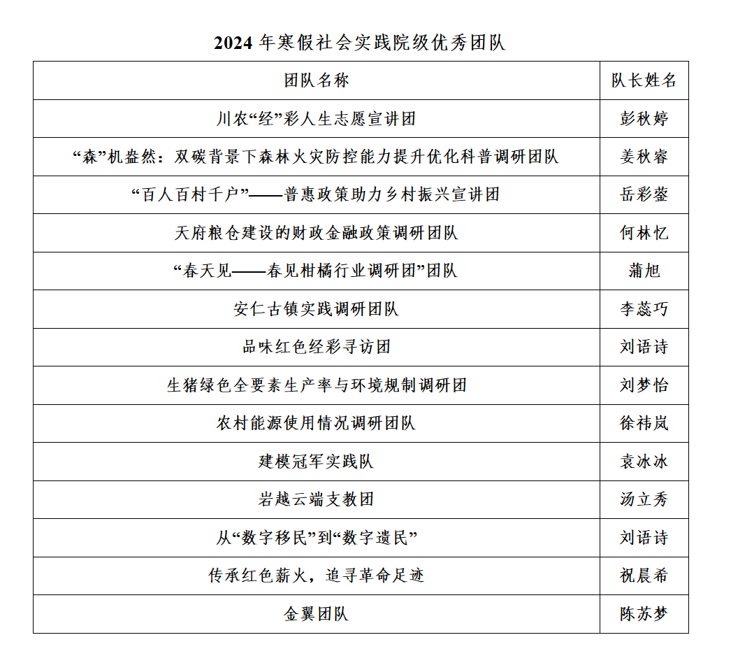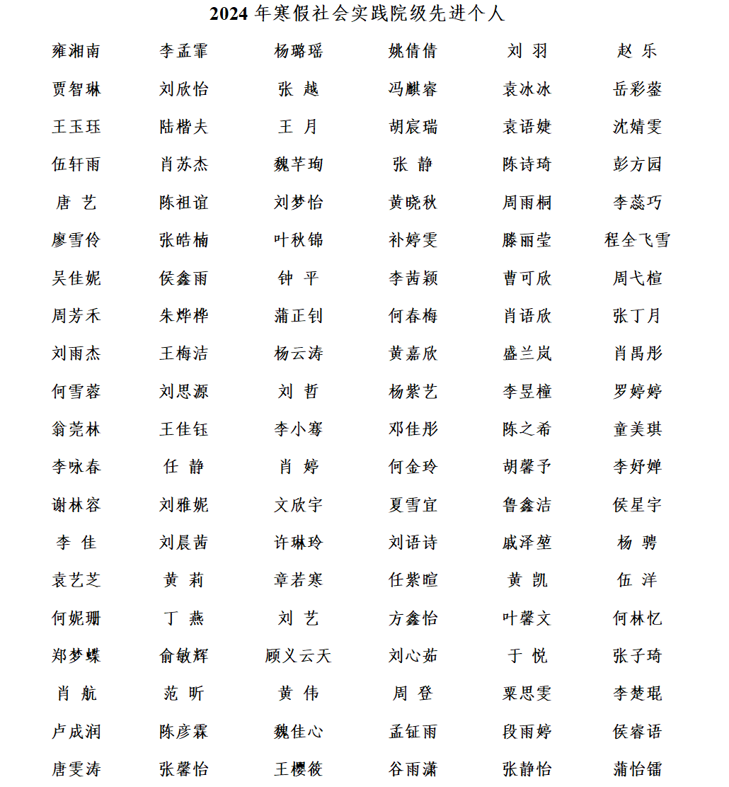 根据校团委《关于开展2024年“返家乡”寒假社会实践评优通知》,经过个人自荐、团支部评议,团队申请、社会实践领导小组评审表彰以下团队和个人,现公示如下。