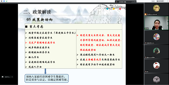 在学生家庭经济困难认定工作培训会上,张翅对2022-2023年资助工作总体安排做出梳理,对已进行的生源地助学贷款工作与服役教育资助工作进行总结,强调服役教育资助工作必须通知到小班每位同学,不能让符合条件的同学错失申请机会。张翅重点解读了家庭经济困难学生认定的政策,详细说明了认定工作的日程安排,对学生在线申请、小班评议、学院督察审核公示、学院复核中的注意事项作出提示。她强调,认定是一切资助工作的基础,要求工作人员必须严格按照工作要求公正评议,在全面、客观、真实掌握好申请者的家庭经济情况的同时,要特别注意评议会议纪律,注意保护申请者的隐私信息。
