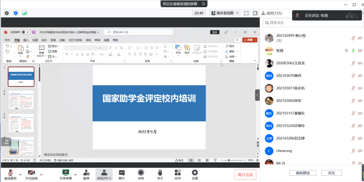 在学生奖励及资助工作培训会上,张翅对2021-2022学年国家助学金评定工作的总体安排、相关规定与政策和注意事项进行了说明。罗利娟就优秀学生、优秀学生干部、国家奖学金及国家励志奖学金等荣誉奖励评定工作相关要求进行说明。会上,两位老师还就与会师生提出的问题进行了解答。