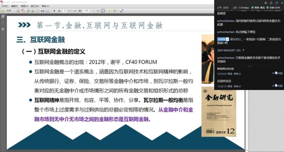 方兴老师的首堂《电子金融》网课排在下午5、6节,遭遇了下午时段的网络用户“最高峰”,慕课平台登不上,QQ群直播连不上麦,在QQ群进行签到后,方兴老师紧急启用第三套方案,在中国青年群体高度聚集的文化社区和视频平台“哔哩哔哩”网站开直播,进行实时讲解和课堂管理,尽管直播弹幕有几十秒的延迟,却丝毫没有影响刷弹幕互动的热情,同学们穿上马甲后,回答问题更活跃了。