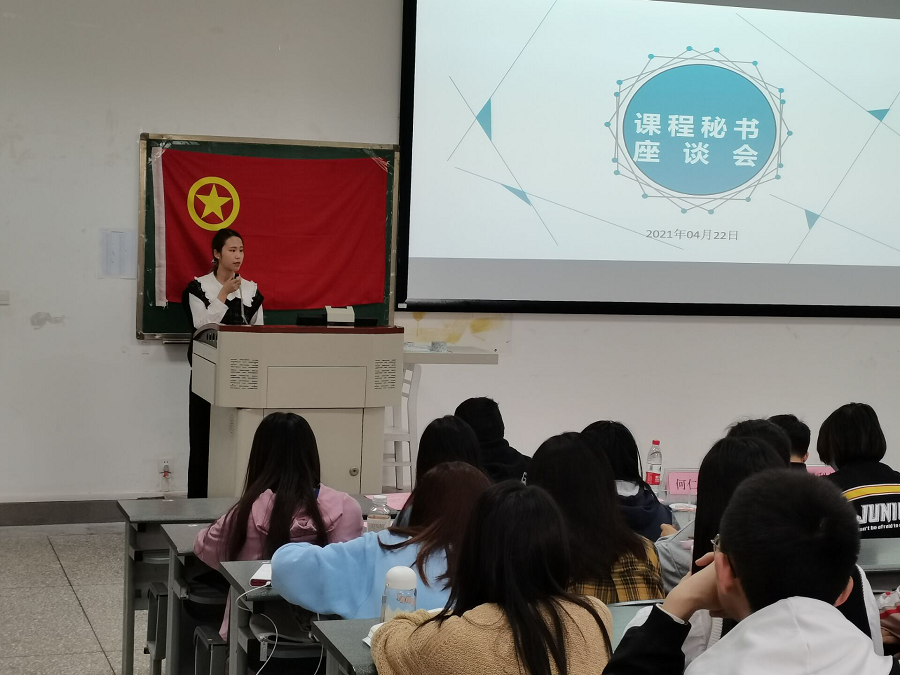 田泽葳担任经济201902班经济法的课程秘书,她认为课程秘书是沟通同学和老师的桥梁,应该起到上传下达的作用。课程秘书要将老师的要求及时有效传达,将同学对课程学习的想法及时的反映给老师。在会上她分享了自己在网课期间任职经验,并表示作为学生课程秘书更能了解班级的学习情况,对问题的看法更贴近同学们的真实想法。