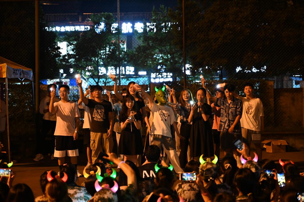 在个人展示之外,更有集体的拉歌。月下团坐,在教官的带领下各营新生们都团结为一个整体,振臂高呼,拉歌声此起彼伏,简单的韵律歌词后是空前凝聚的团队精神,是你中有我的荣辱与共,是心心相印的携手同行!