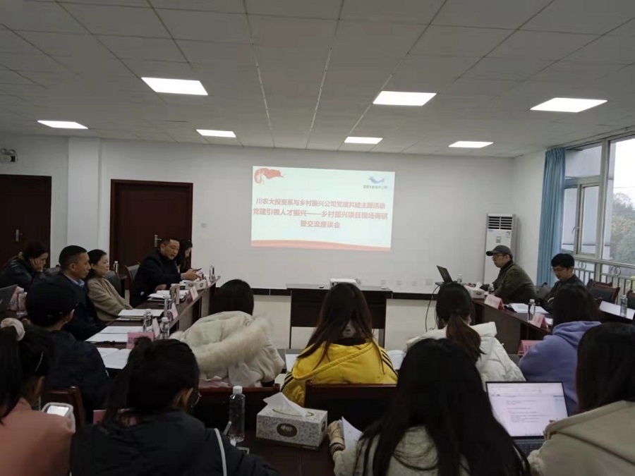 在蜀都乡村振兴公司总部,公司党支部书记、董事长何艨代表公司对与会的师生表示热烈欢迎,并向大家介绍了公司的基本情况。公司总经理汪建波介绍了公司围绕乡村振兴战略在国有资产管理、公私合营、风险管理等方面采取的有关做法和经营策略。王玉峰代表与会师生对公司的盛情接待表示感谢,并介绍了乡村振兴项目投融资分析大赛的整体情况,鼓励与会学子珍惜难得的实地调研机会,将此次调研掌握的新知识和新情况转化为竞赛中的优异成绩。会上,双方针对农业农村项目投资、农村集体用地、公司战略发展等问题进行了广泛的交流和讨论。
