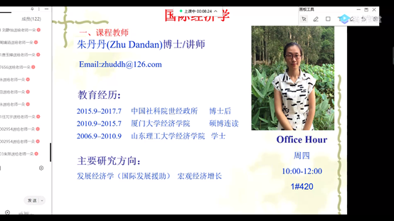“乌云遮不住升起的太阳,疫情挡不住春天的来临,学院对接了少数处于中高风险地区的授课教师与学生,合理安排在校学生的教学课程,实验中心加班加点为线上教学提供了可靠的技术保障。”在《微观经济学》的课堂上,丁昭老师以一段精彩的开场白,透过屏幕点燃了同学们的热情,融化了疫情笼罩在心中的阴霾;朱丹丹老师通过腾讯会议为同学们讲授着《国际经济学》课程,网页上框架清晰的图片,传递着新鲜的经济学知识;在《金融工程学》的线上课堂上,张帮正老师早早准备好了线上教学资料与文献,与同学们进行着《金融工程学》的学习和互动;在《商务英语》的线上课堂上,郭华老师随时调整课堂节奏、讲话语速,做到了要点全覆盖、难点着重讲,达到了良好的教授效果。