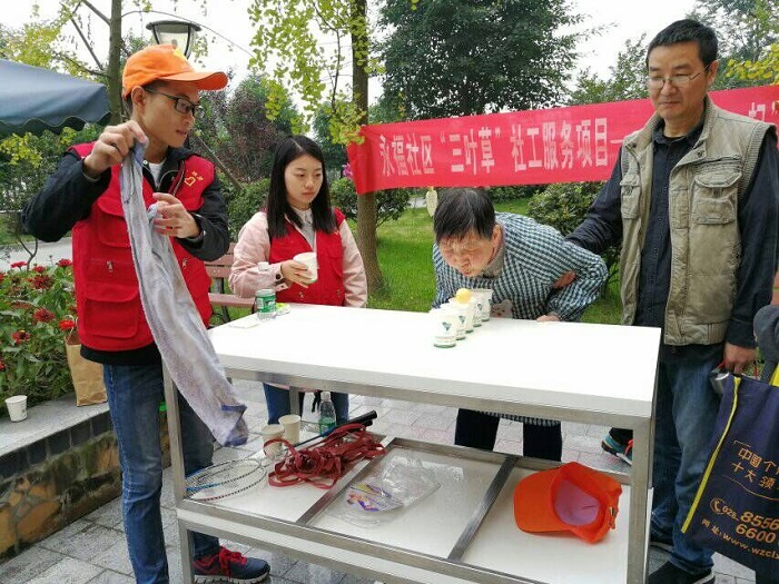惠民社区和永福社区是澳门永利yl6776“党支部进社区”项目的长期合作单位,这里的老人们和澳门永利yl6776志愿者们已经是“老熟人”了。28日重阳节这天,志愿者又和这些可爱的老人们聚在了一起。在惠民社区居民文化广场上,澳门永利yl6776志愿者们耐心讲解、悉心陪伴老人们完成“绑腿小碎步”、“手语传递”、制作茱萸香囊等活动;在永福社区社工站举办的“重阳节茶话会”上,老人们愉快地与志愿者们唠嗑、话家常。国贸2017级3班的韩燕玲感慨道:“都说陪伴是最长情的告白,和这些爷爷奶奶们也从陌生到熟悉,看着他们的家人越来越多地陪伴着他们来参加活动,感觉自己所做的这一切也变得更加有意义了。”