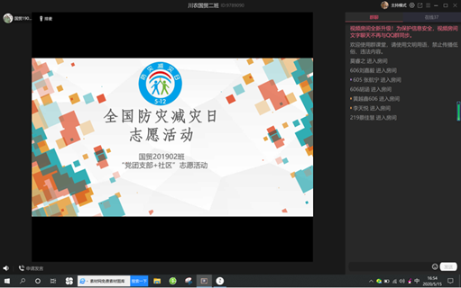 为了进一步唤起人们对防灾减灾工作的高度关注,国贸201902支部与堰山和畔二期社区居民于5月15日-17日,以线上群课堂以及居民微信群知识竞答等多种形式,开展了“宣讲科学减灾,你我一起同行”的志愿活动。本次活动共有37位同学以及26位社区居民参与,同学们与社区居民在活动中表现踊跃积极,最终圆满实现了普及推广防灾减灾知识和避灾自救技能的目的。